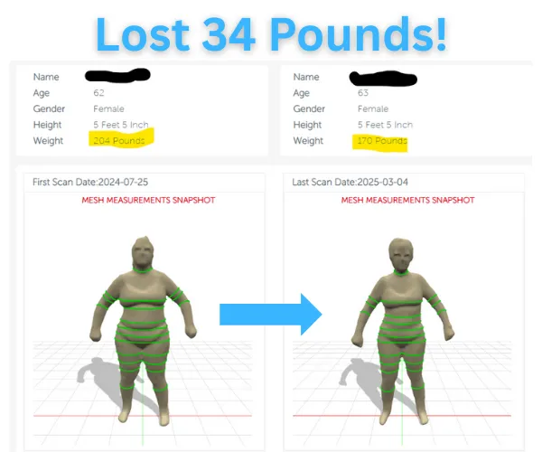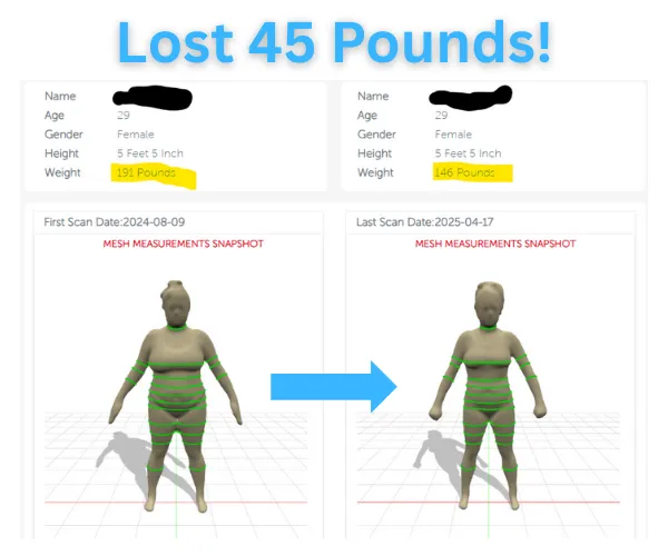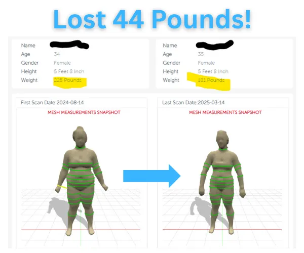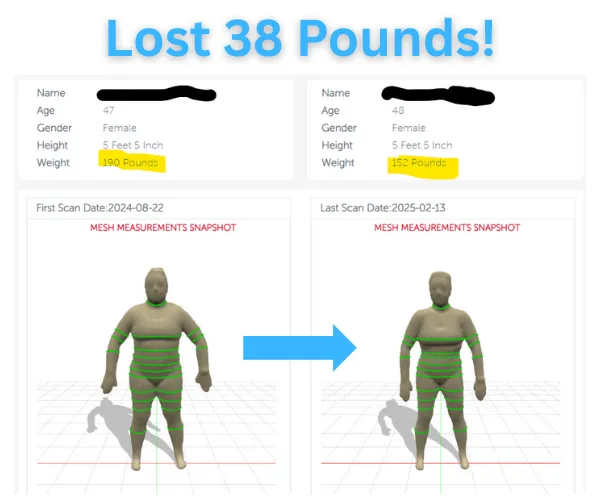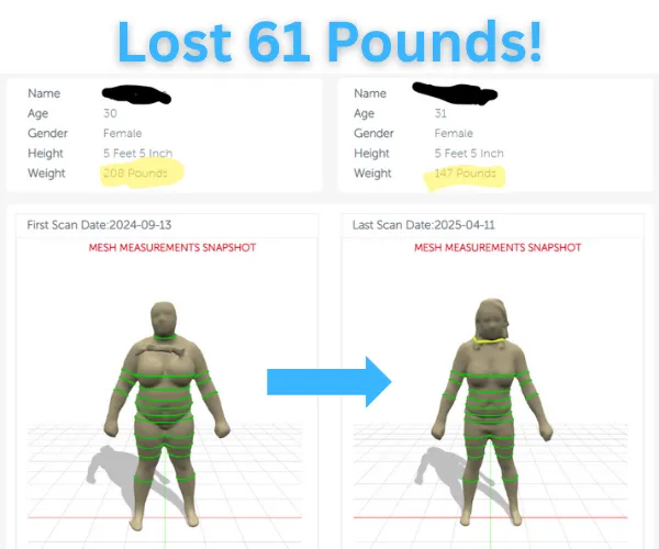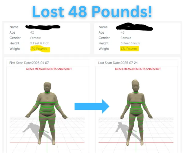 This scan helps us know how that you are losing fat while keeping muscle. It also shows us how many inches you have lost off your stomach, legs, arms, etc., which is amazing and motivating to see!